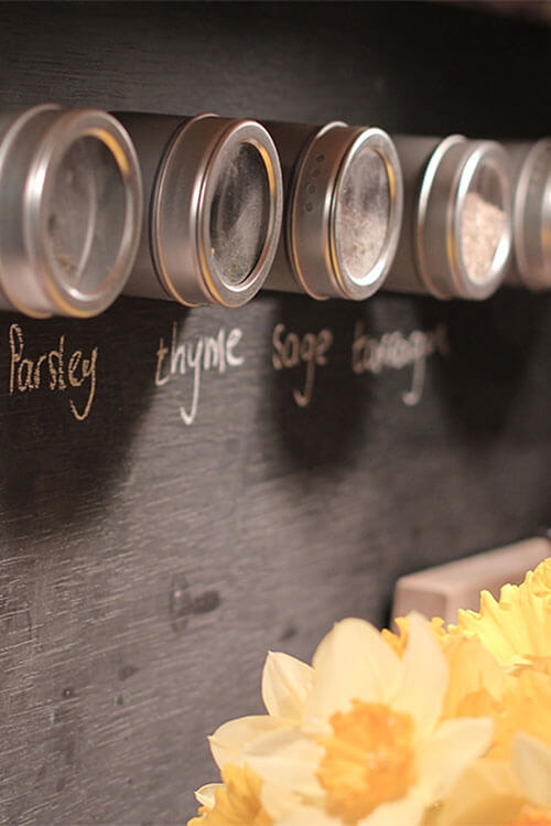 By simply cutting plywood to size and painting it with chalkboard paint, our new splashbacks are fun, and give the kitchen a dramatically different look. We could easily repaint the plywood if we wanted to try something else (stencils would work well with this idea), and the boards are attached with a light-bond glue, so they’re easy to remove.