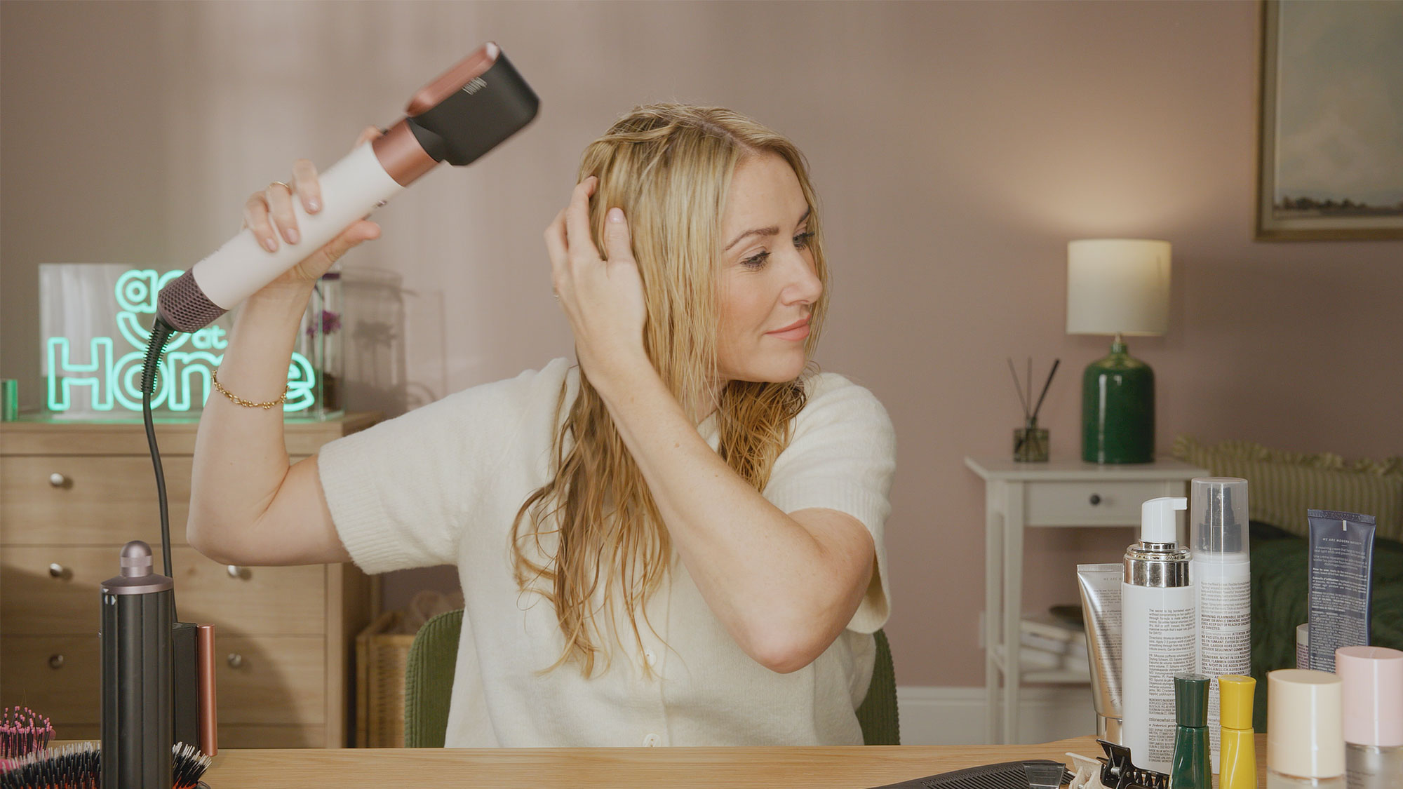 Using the pre-styling dryer attachment, dry your hair about 80% of the way. Since the Airwrap barrels can’t get right up the roots, get them nice and dry for some added volume.