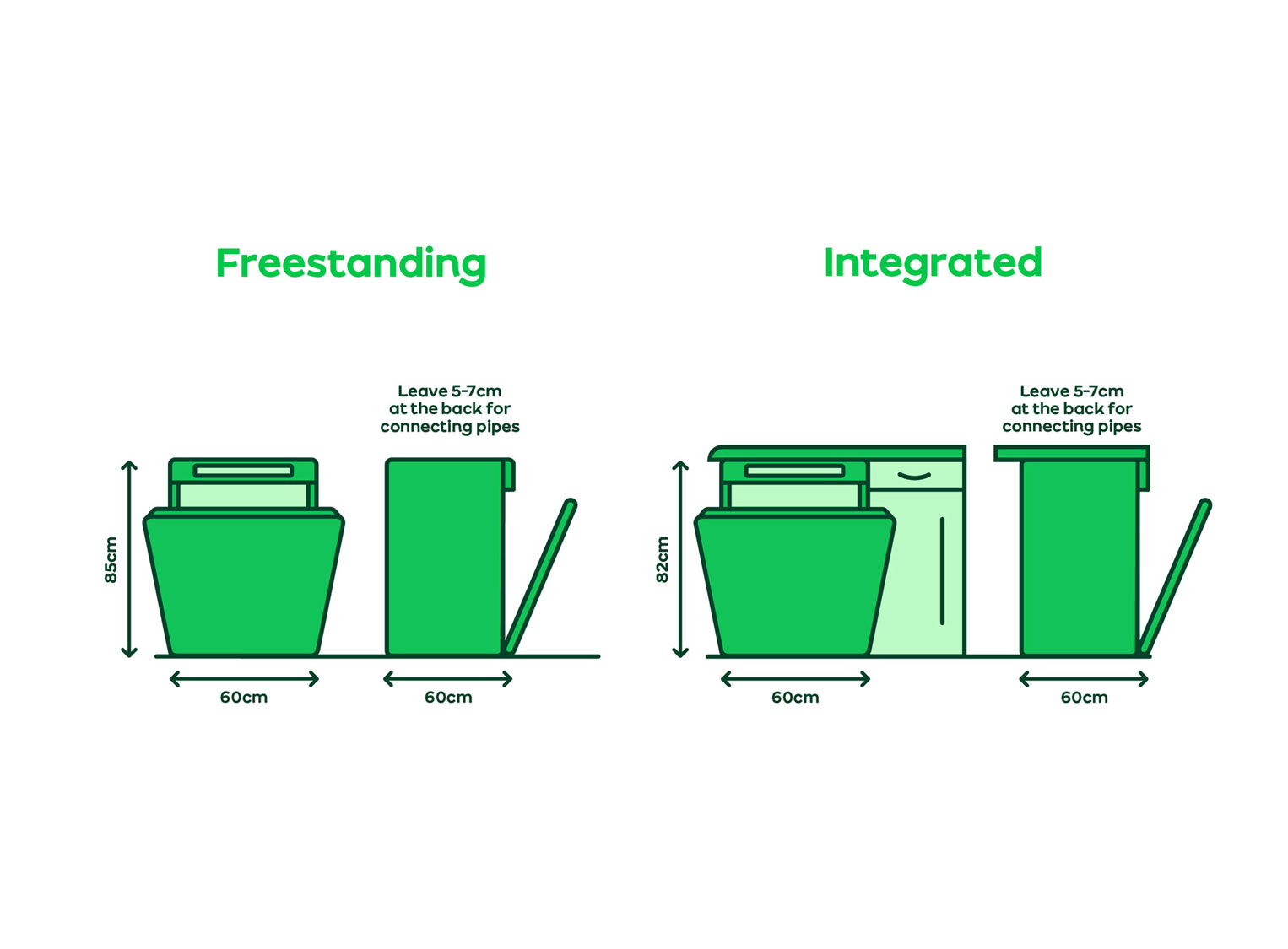 Most full-size models stick to pretty similar measurements: around 60cm wide, 82 to 85cm tall, and a depth of 55 to 60cm.