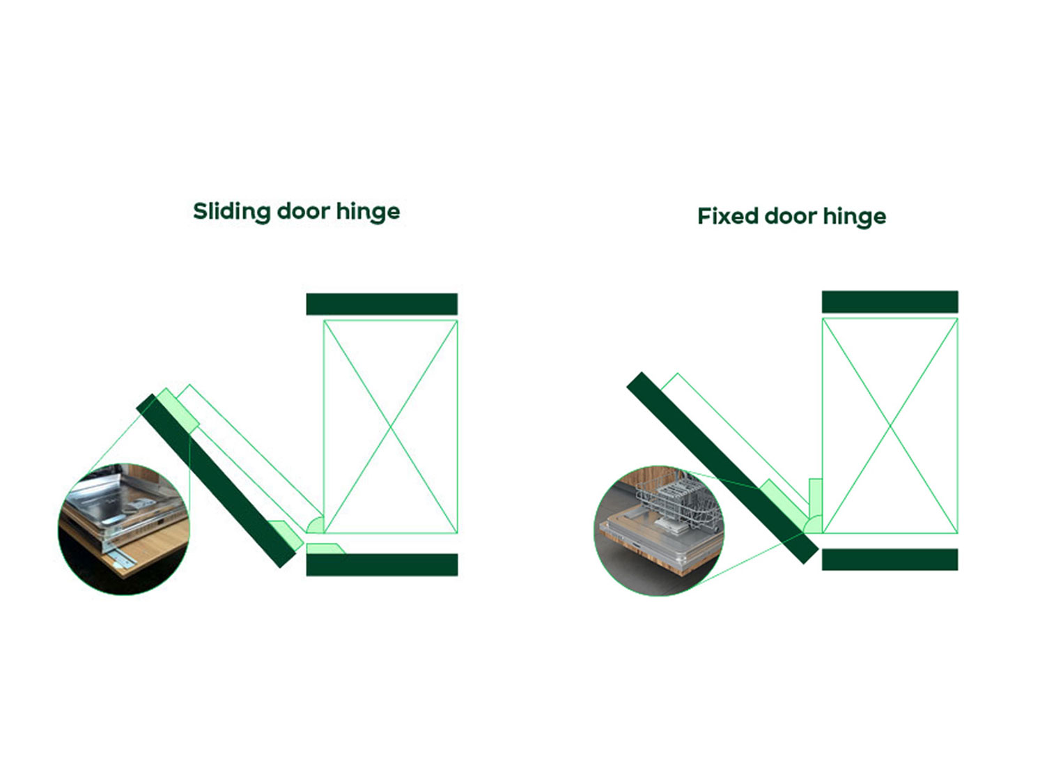A fixed hinge connects the cabinet door directly to the dishwasher for a snug fit – this is ideal for heavier models.
