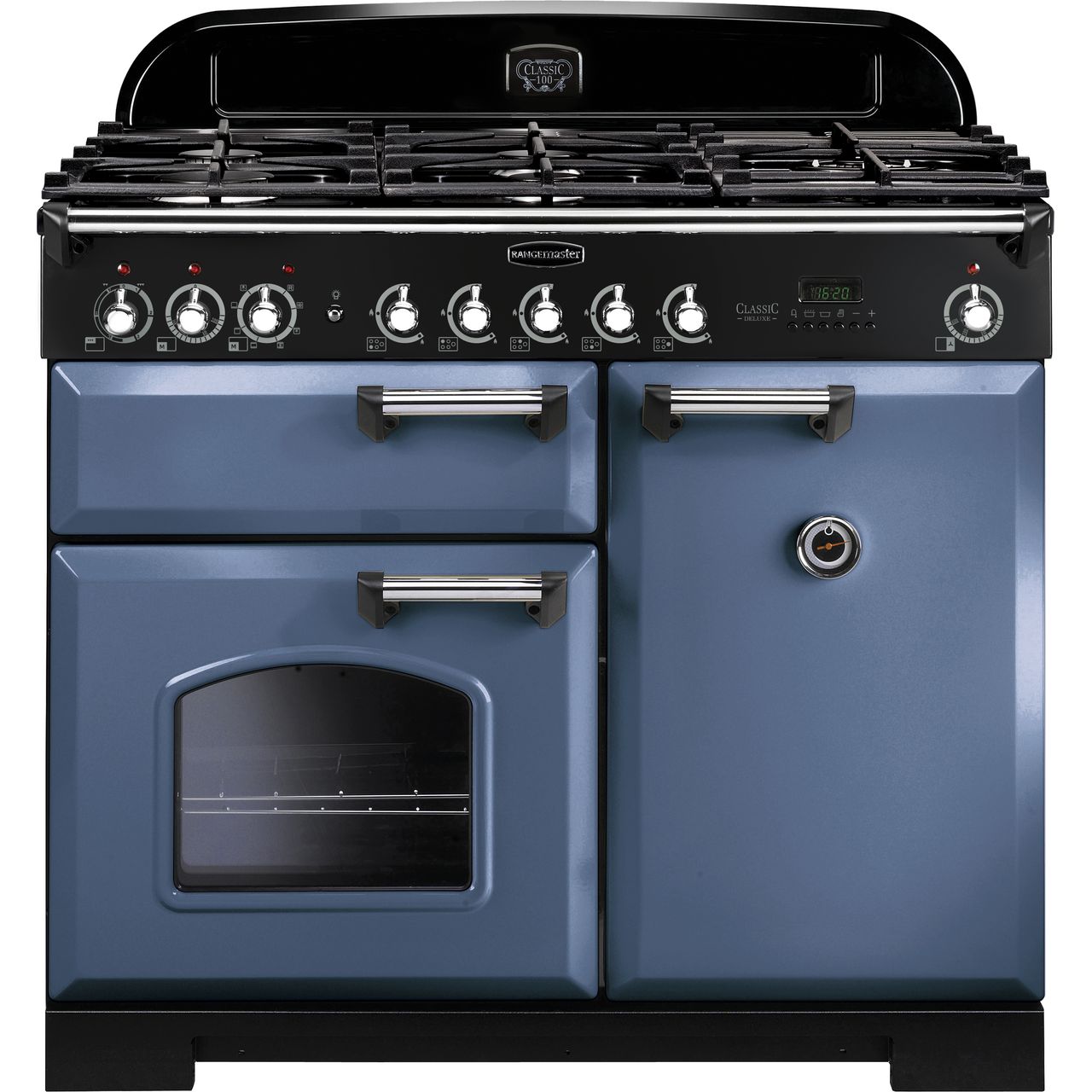 Rangemaster Classic Deluxe CDL100DFFSB/C 100cm wide Dual Fuel Range Cooker with Gas Hob - Stone Blue / Chrome - A/A Rated