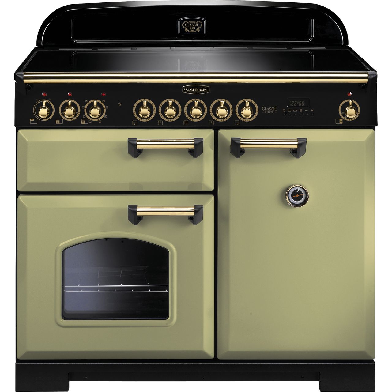 Rangemaster Classic Deluxe CDL100EIOG/B 100cm wide Electric Range Cooker with Induction Hob - Olive Green / Brass - A/A Rated