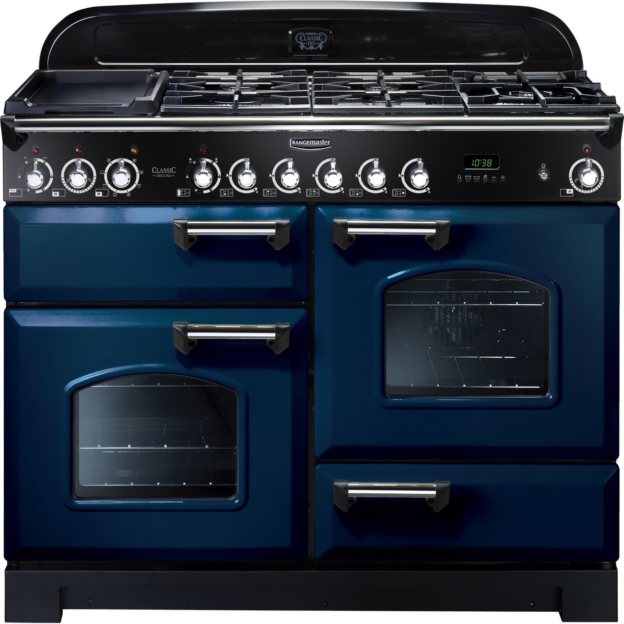 Rangemaster Classic Deluxe CDL110DFFRB/C 110cm wide Dual Fuel Range Cooker with Gas Hob - Regal Blue / Chrome - A/A Rated