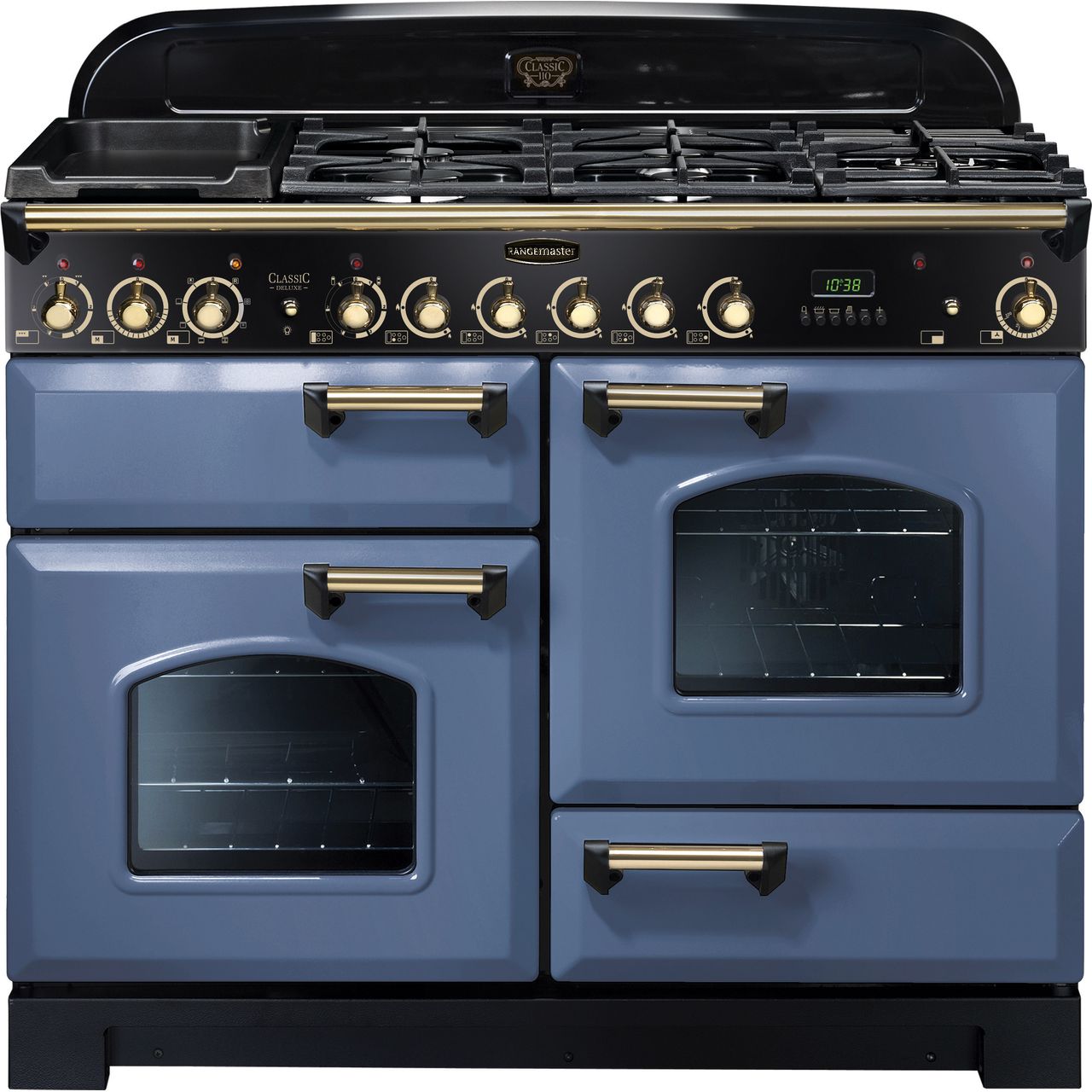 Rangemaster Classic Deluxe CDL110DFFSB/B 110cm wide Dual Fuel Range Cooker with Gas Hob - Stone Blue / Brass - A/A Rated