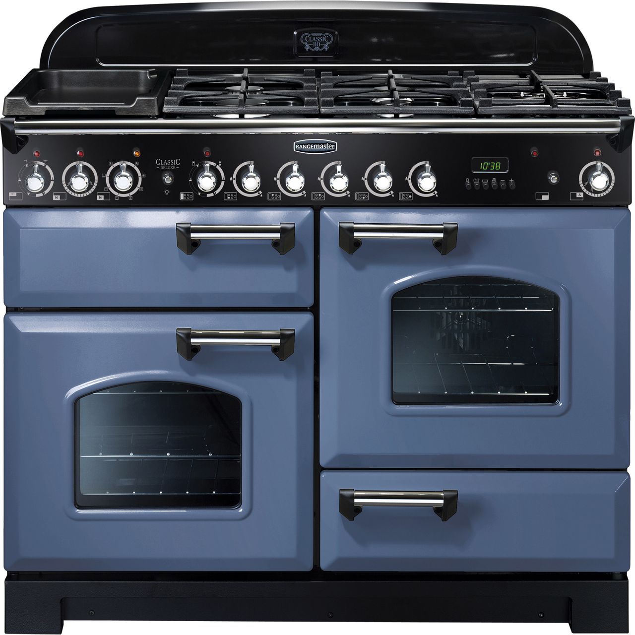 Rangemaster Classic Deluxe CDL110DFFSB/C 110cm wide Dual Fuel Range Cooker with Gas Hob - Stone Blue / Chrome - A/A Rated