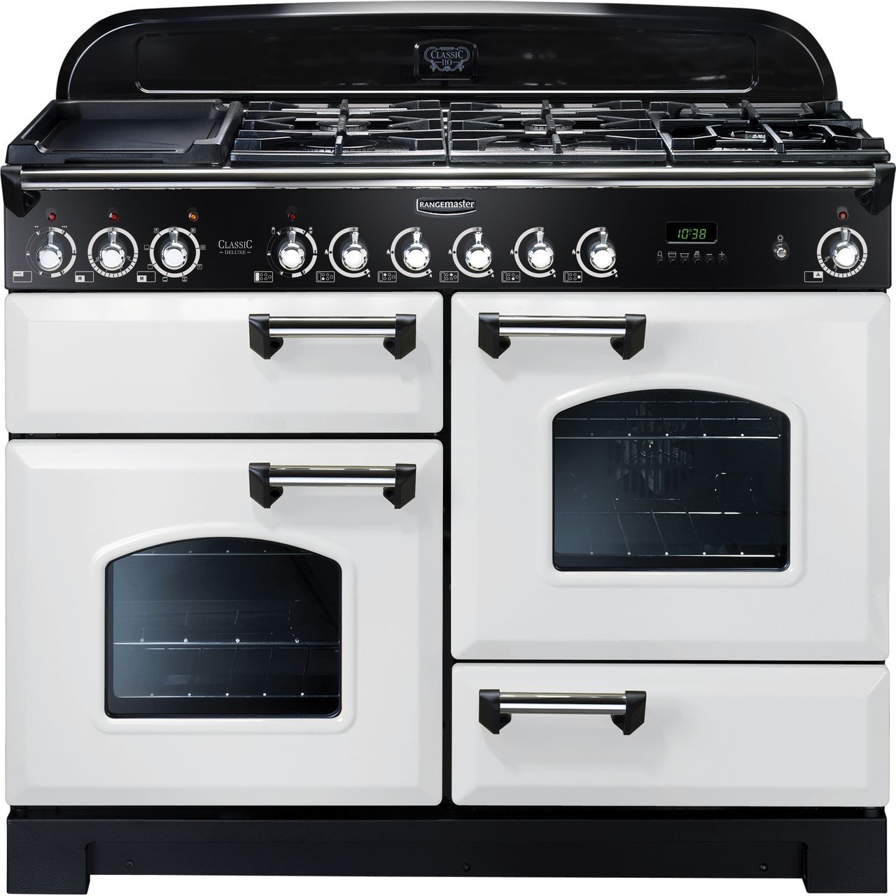 Rangemaster Classic Deluxe CDL110DFFWH/C 110cm wide Dual Fuel Range Cooker with Gas Hob - White / Chrome - A/A Rated