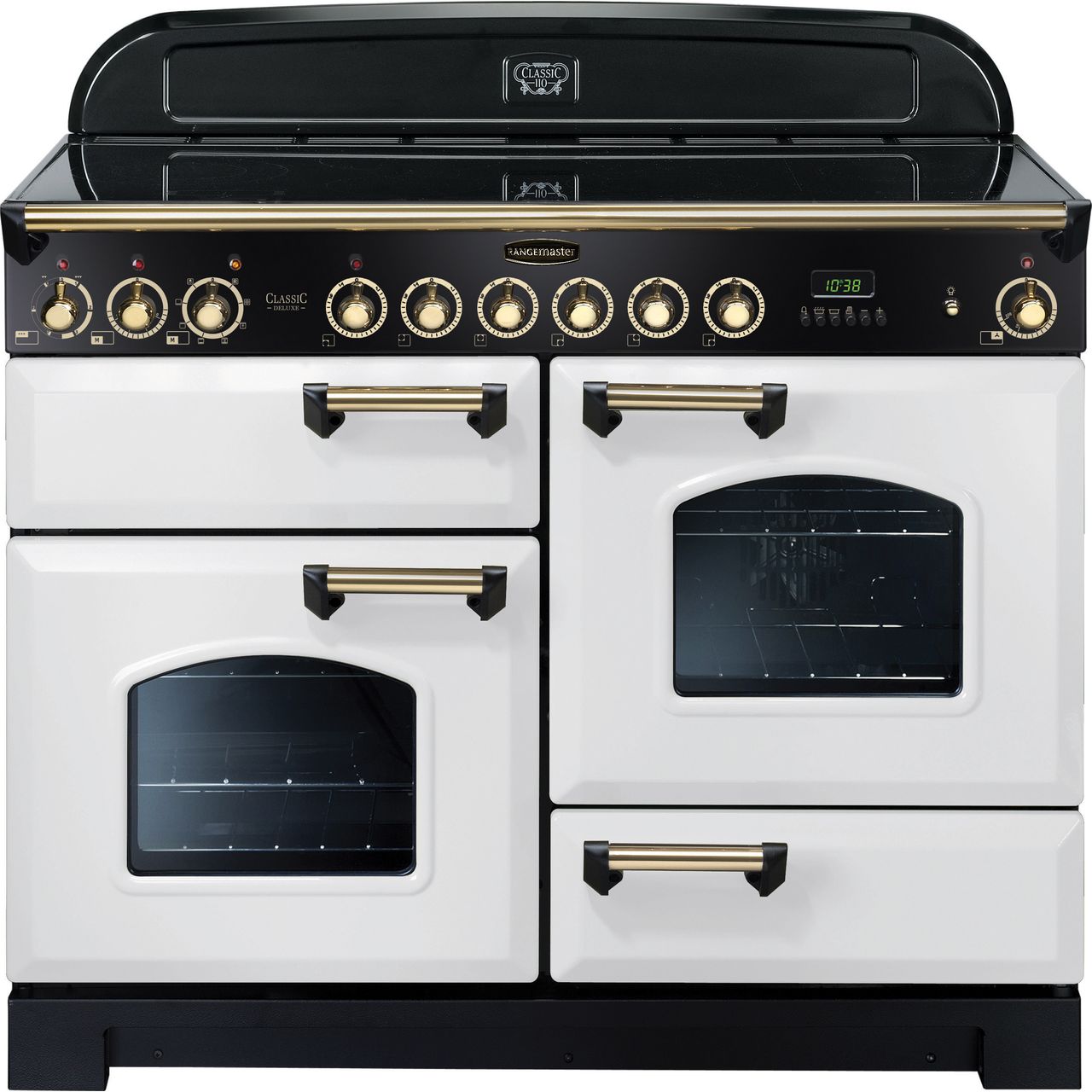 Rangemaster Classic Deluxe CDL110ECWH/B 110cm wide Electric Range Cooker with Ceramic Hob - White / Brass - A/A Rated