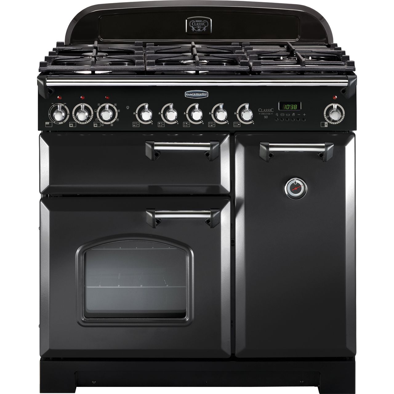 Rangemaster Classic Deluxe CDL90DFFCB/C 90cm wide Dual Fuel Range Cooker with Gas Hob - Charcoal Black / Chrome - A/A Rated