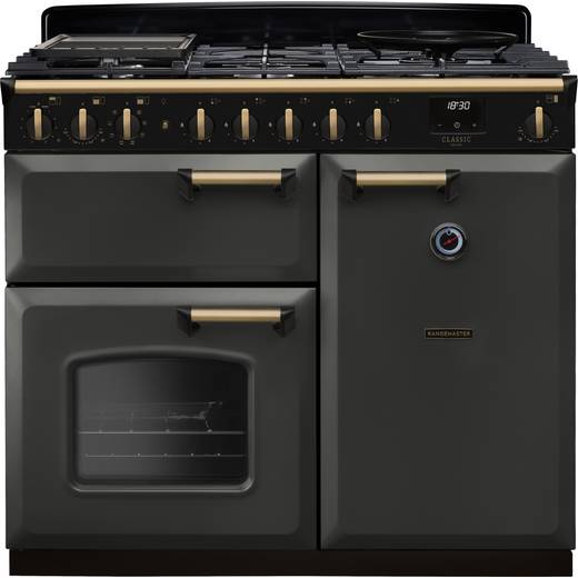 Rangemaster Classic Deluxe 100 Dual Fuel CLDL100DFPSLT/AB1 100cm wide Dual Fuel Range Cooker with Gas Hob - Slate / Antique Brass - A Rated