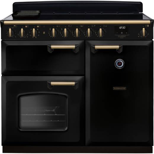 Rangemaster Classic Deluxe CLDL100EIPGBL/AB1 100cm wide Electric Range Cooker with Induction Hob - Black / Antique Brass - A/A Rated