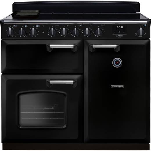 Rangemaster Classic Deluxe CLDL100EIPGBL/CM1 100cm wide Electric Range Cooker with Induction Hob - Black / Chrome - A/A Rated