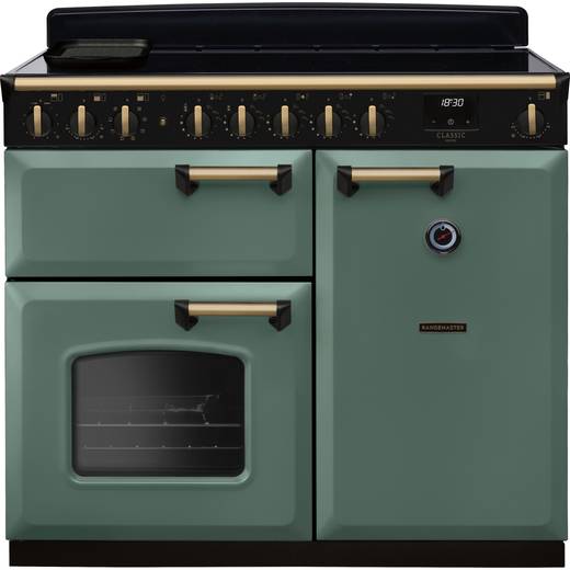Rangemaster Classic Deluxe CLDL100EIPMGR/AB1 100cm wide Electric Range Cooker with Induction Hob - Mineral Green / Antique Brass - A/A Rated