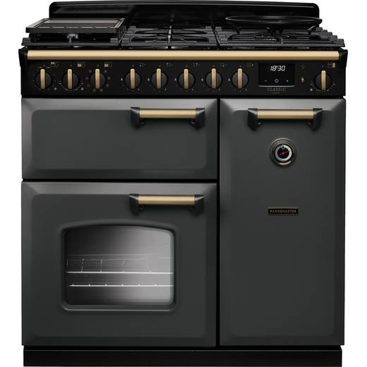 Rangemaster Classic Deluxe 90 CLDL90DFPSLT/AB1 90cm wide Dual Fuel Range Cooker with Gas Hob - Slate / Antique Brass - A Rated