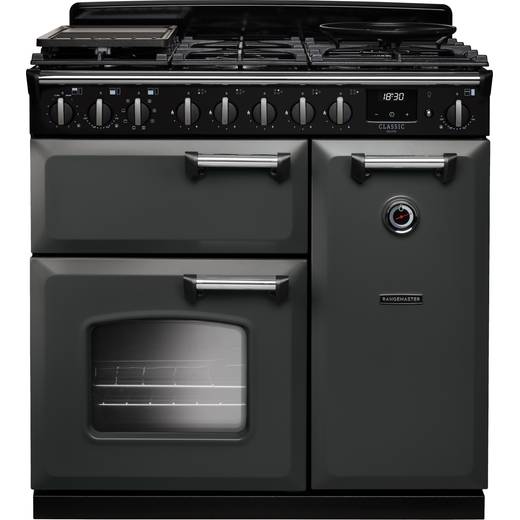 Rangemaster Classic Deluxe CLDL90DFPSLT/CM1 90cm wide Dual Fuel Range Cooker with Gas Hob - Slate / Chrome - A Rated