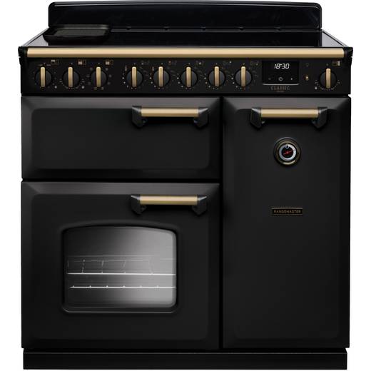 Rangemaster Classic Deluxe CLDL90EIPCBL/AB1 90cm wide Electric Range Cooker with Induction Hob - Charcoal Black / Antique Brass - A/A Rated