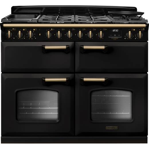 Rangemaster Classic Deluxe 110 CLDLB110DFPCBL/AB1 110cm wide Dual Fuel Range Cooker with Gas Hob - Charcoal Black / Antique Brass - A/A/A Rated
