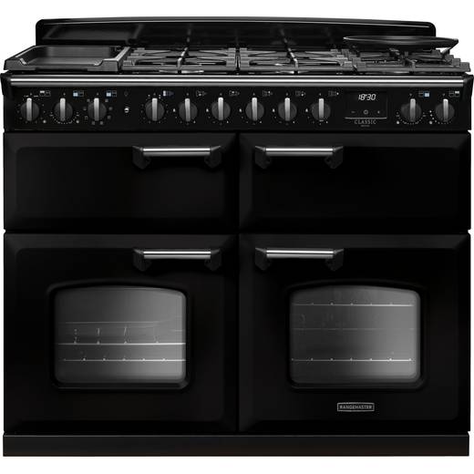 Rangemaster Classic Deluxe CLDLB110DFPGBL/CM1 110cm wide Dual Fuel Range Cooker with Gas Hob - Black / Chrome - A Rated