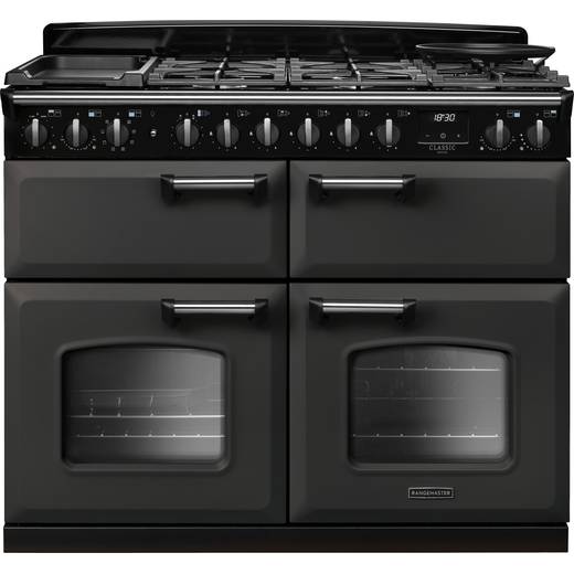 Rangemaster Classic Deluxe CLDLB110DFPSLT/CM1 110cm wide Dual Fuel Range Cooker with Gas Hob - Slate / Chrome - A Rated