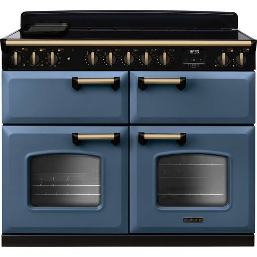 Rangemaster Classic Deluxe BC CLDLB110EIPSTB/AB1 110cm wide Electric Range Cooker with Induction Hob - Stone Blue / Antique Brass - A/A Rated