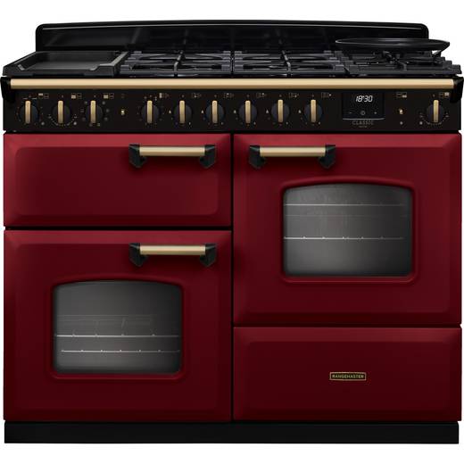 Rangemaster Classic Deluxe 110 CLDLO110DFPBOR/AB1 110cm wide Dual Fuel Range Cooker with Gas Hob - Bordeaux / Chrome - A Rated