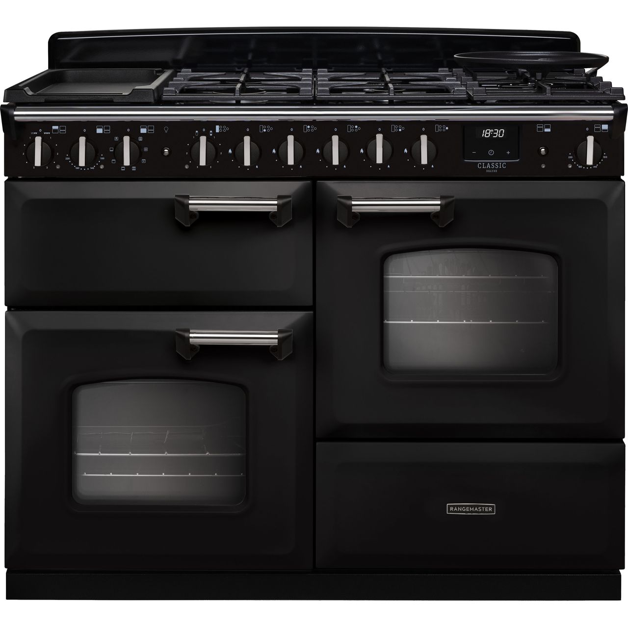 Rangemaster Classic Deluxe 110 CLDLO110DFPCBL/CM1 110cm wide Dual Fuel Range Cooker with Gas Hob - Charcoal Black / Chrome - A Rated