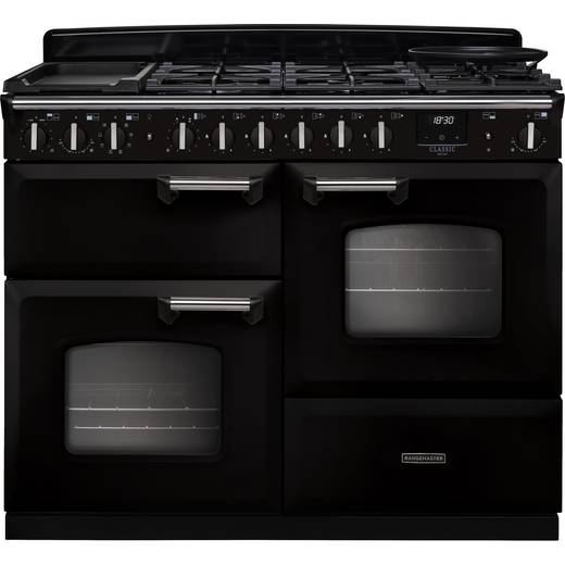 Rangemaster Classic Deluxe 110 CLDLO110DFPGBL/CM1 110cm wide Dual Fuel Range Cooker with Gas Hob - Black / Chrome - A Rated