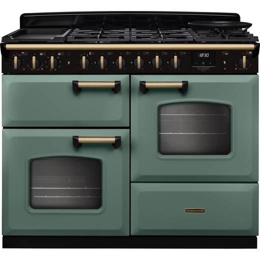Rangemaster Classic Deluxe 110 CLDLO110DFPMGR/AB1 110cm wide Dual Fuel Range Cooker with Gas Hob - Mineral Green / Antique Brass - A Rated