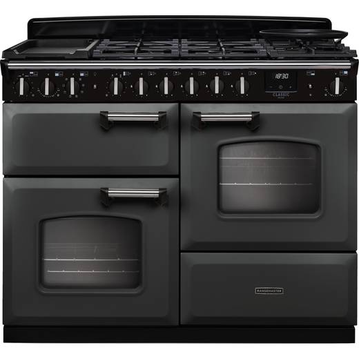 Rangemaster Classic Deluxe 110 CLDLO110DFPSLT/CM1 110cm wide Dual Fuel Range Cooker with Gas Hob - Slate / Chrome - A Rated