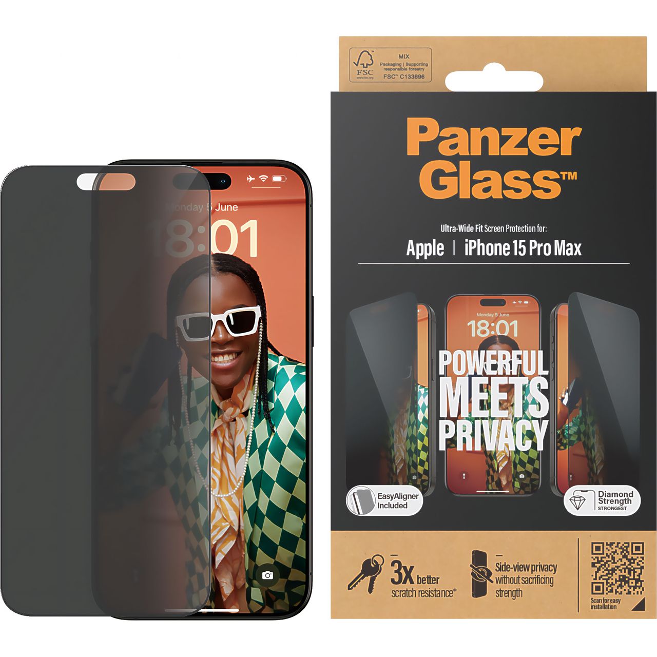 PanzerGlass Privacy Glass Screen Protector for iPhone 15 Pro Max - Ultra-Wide Fit - Transparent